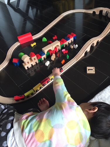 働く車が大好きなグレちゃん。 絵本は電車が好きですが、実はレールを走る電車のおもちゃは 一つも持っていませんでした(唯一、ディズニーで買ったトイストーリー列車のみ)。 で、土曜日に私の職場まで夫子供が来たので、帰りにIKEA港北へ寄ることに。 い…
